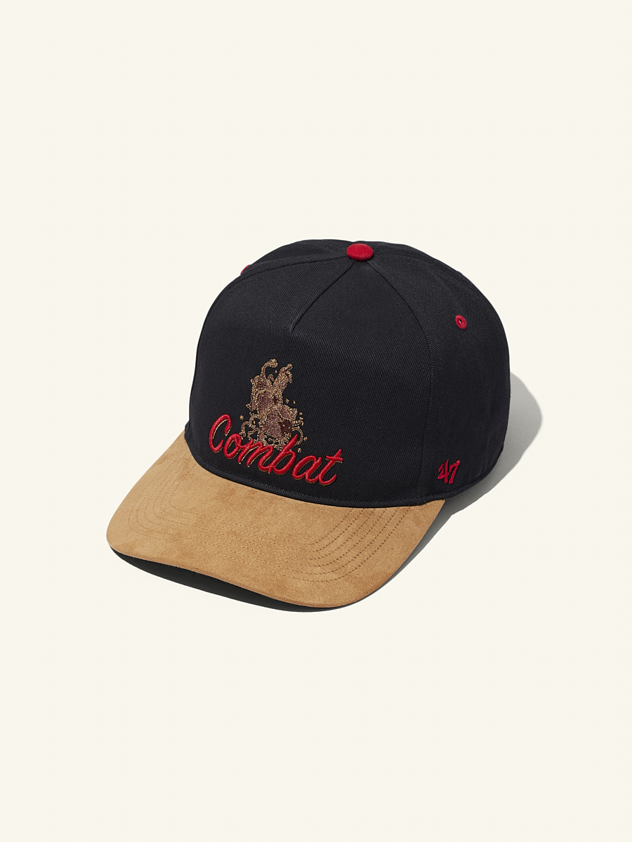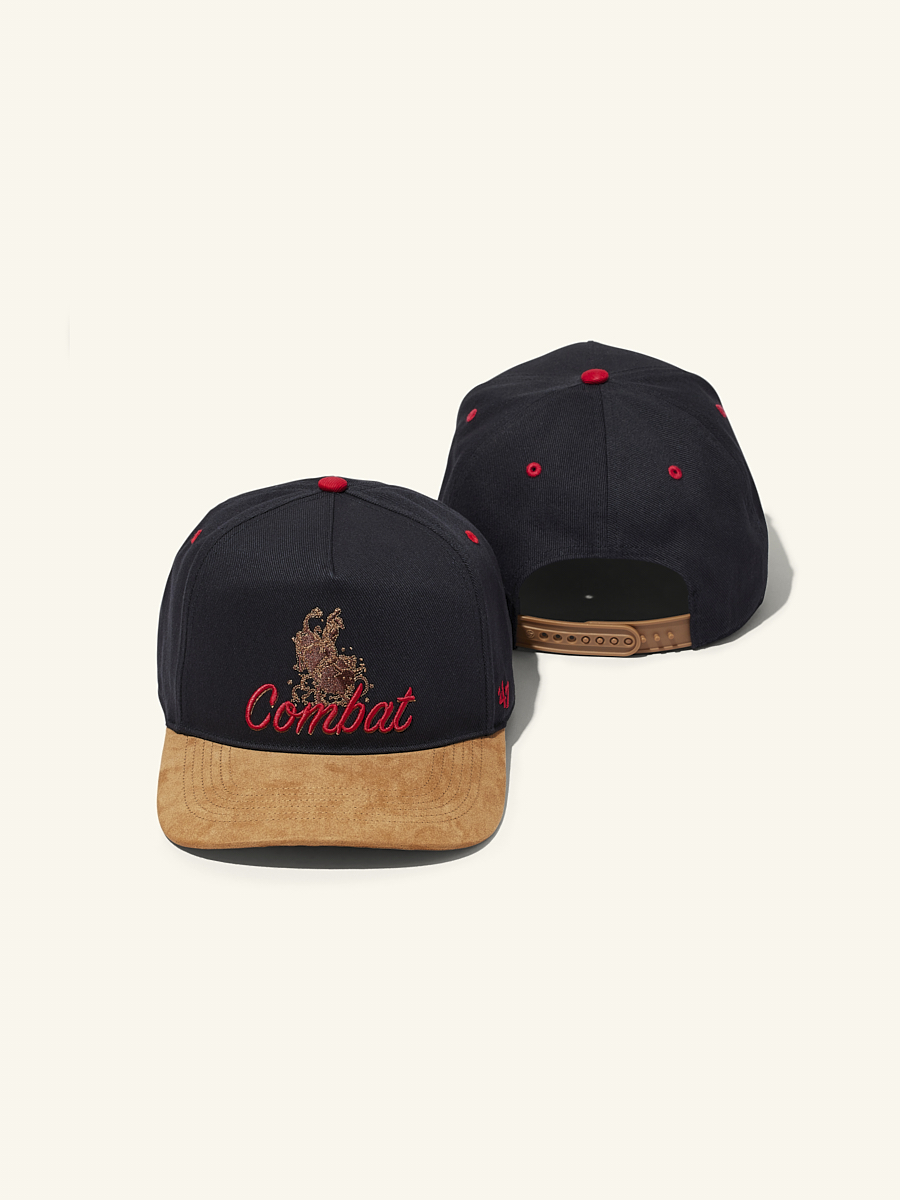 Its dark black crown and rich suede brown visor creates a bold contrast meant for elite wranglers. The front features a pro-bull ride graphic and flowing COMBAT script in raised embroidery, delivering a gritty yet polished look.